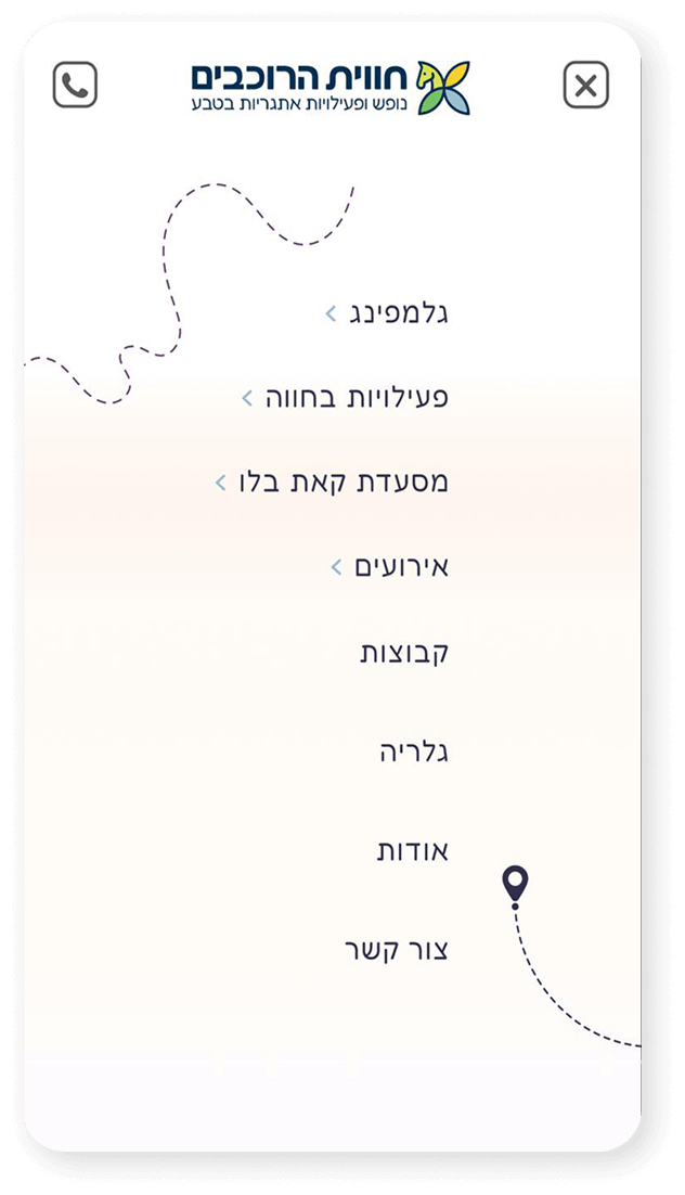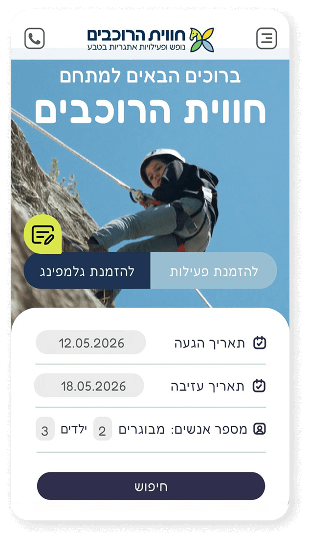 The website is designed to preserve the natural atmosphere of the location on Mount Carmel, immediately immersing visitors in the sense of nature and adventure. The colors – sky blue, deep navy, green, and yellow – create perfect harmony, while curved, flowing elements accompanying the content evolve as users scroll, adding motion and vitality and highlighting the dynamic and unique character of the experience.