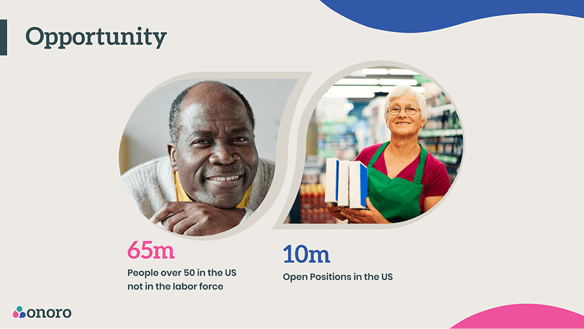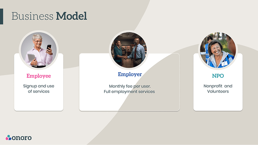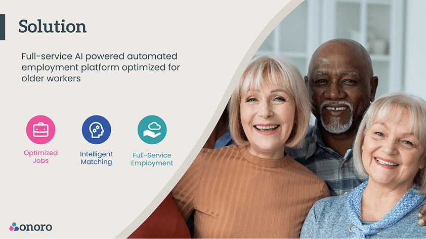 By leveraging intelligent algorithms, Onoro’s primary objective is to empower older adults to age with dignity and live healthier and happier lives through renewed employment opportunities and provide the secure, flexible bridge required to connect them with forward-thinking organizations.