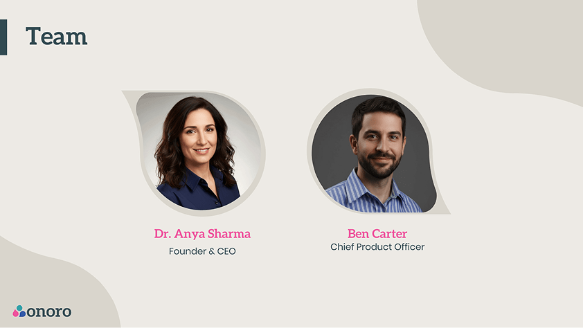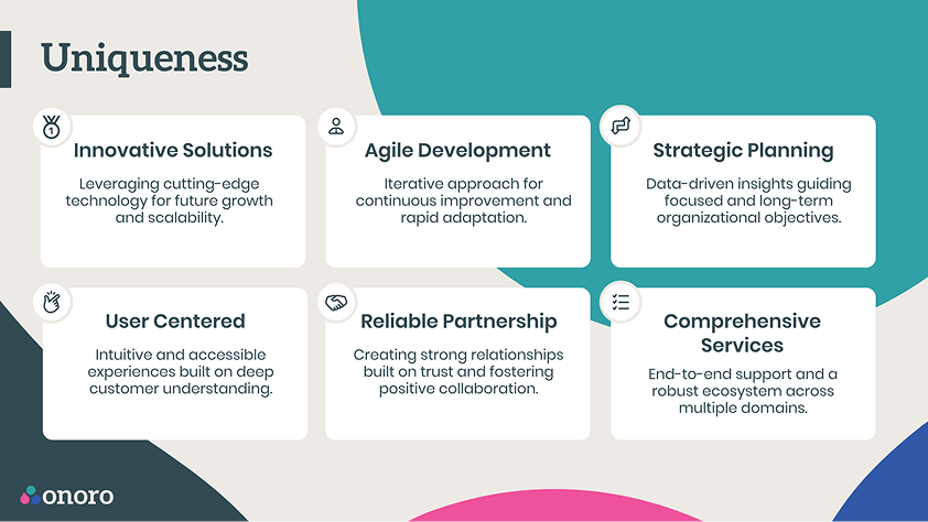 The Onoro presentation employs a visual style that is optimistic and professionally trustworthy. The design is defined by soft, organic shapes and a distinct three-color palette (deep teal, vibrant pink, and bright blue). Asymmetrical background shapes create a subtle dynamic flow that prevents visual stagnation. This design choice, combined with a consistent structure and the use of diverse, positive imagery of older adults, successfully makes the important, “deep” subject matter feel engaging, accessible, and honorable without being heavy.